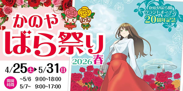 かのやばら園は、8haの広大な敷地に3万5千株のバラが植えられた日本最大規模を誇るバラ園です。バラの見頃となる春と秋には、「かのやばら祭り」を開催しています。特に春の開花シーズンは、鹿児島の温暖な気候を生かし、全国に先駆けて毎年5月のゴールデンウィーク頃に満開を迎えます。