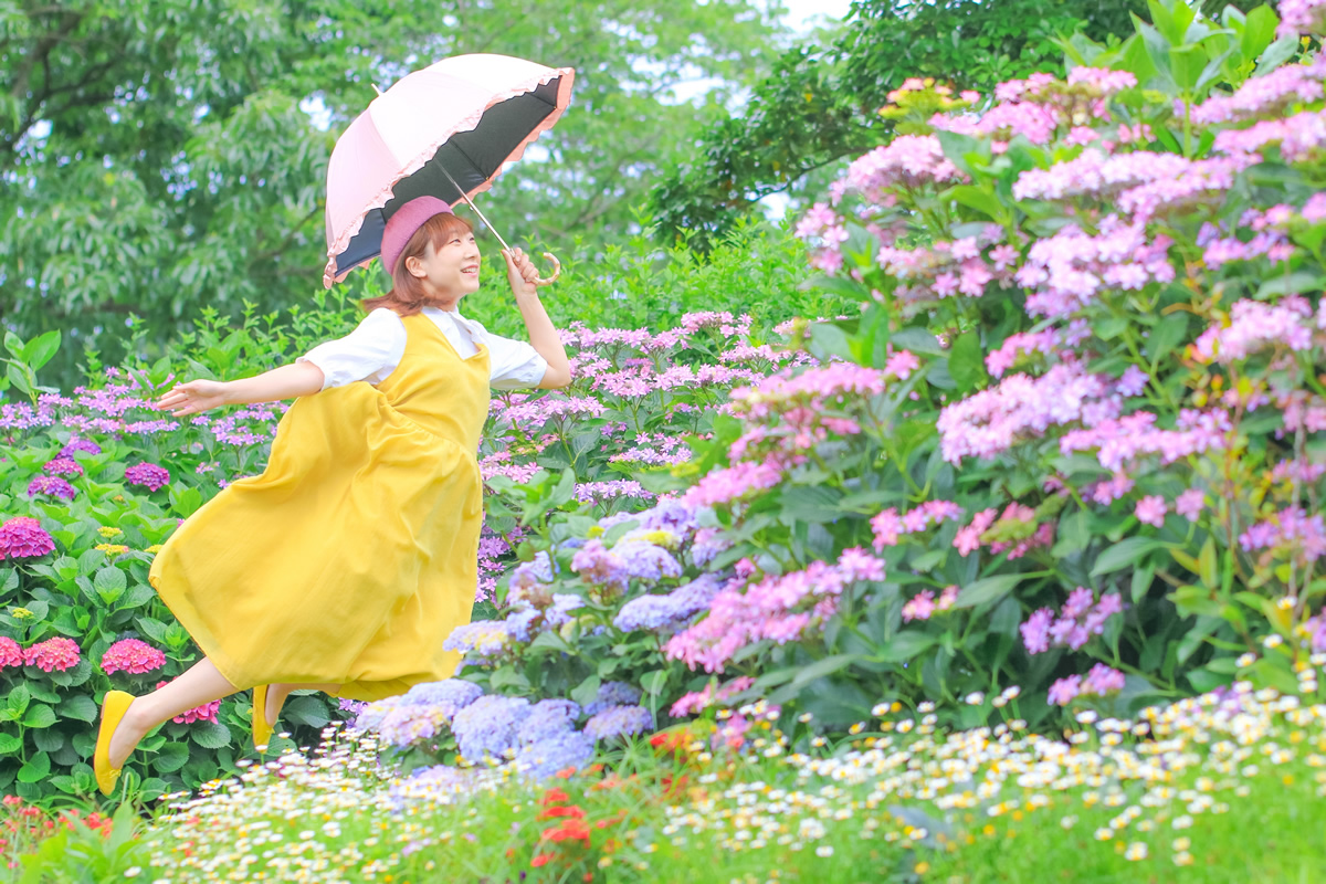 紫陽花の時季に初めて訪れました。遅咲きのばらと見頃が重なって、園内どこを見ても美しかったです。応募作品は自分の中のベスト1の紫陽花を見つけたりして楽しんでいる様子を記念に撮ったものです。いつか、ばらの妖精ばららちゃんと一緒に園内を浮遊散策するのが夢です。