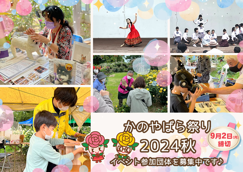 10月26日(土)~11月24日(日)に開催予定の「かのやばら祭り2024秋」に、イベントや出店等での参加を希望する団体(サークル・部活動など)又は個人 を募集します。