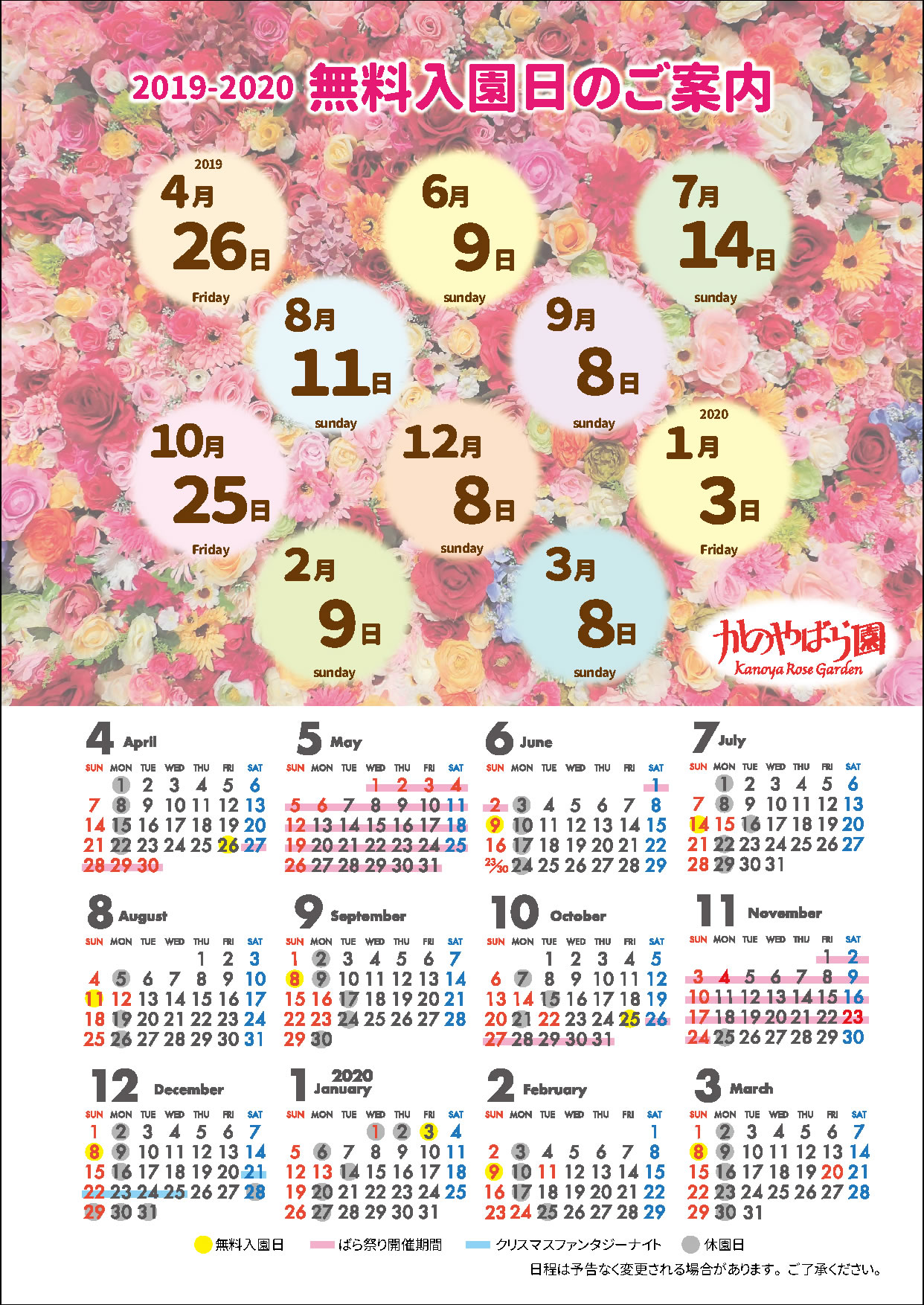 かのやばら園からの2019年-2020年 無料入園日のご案内です。